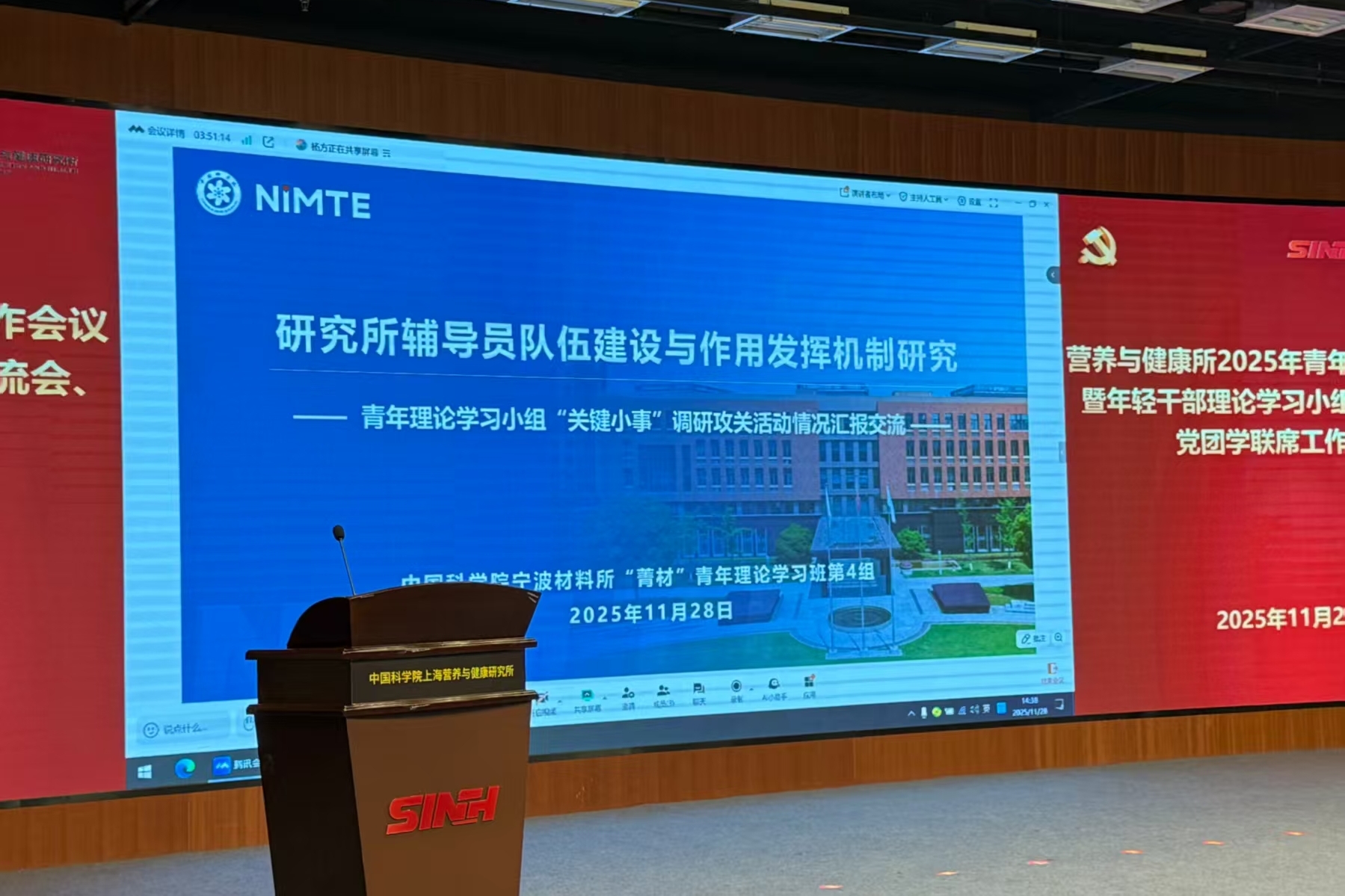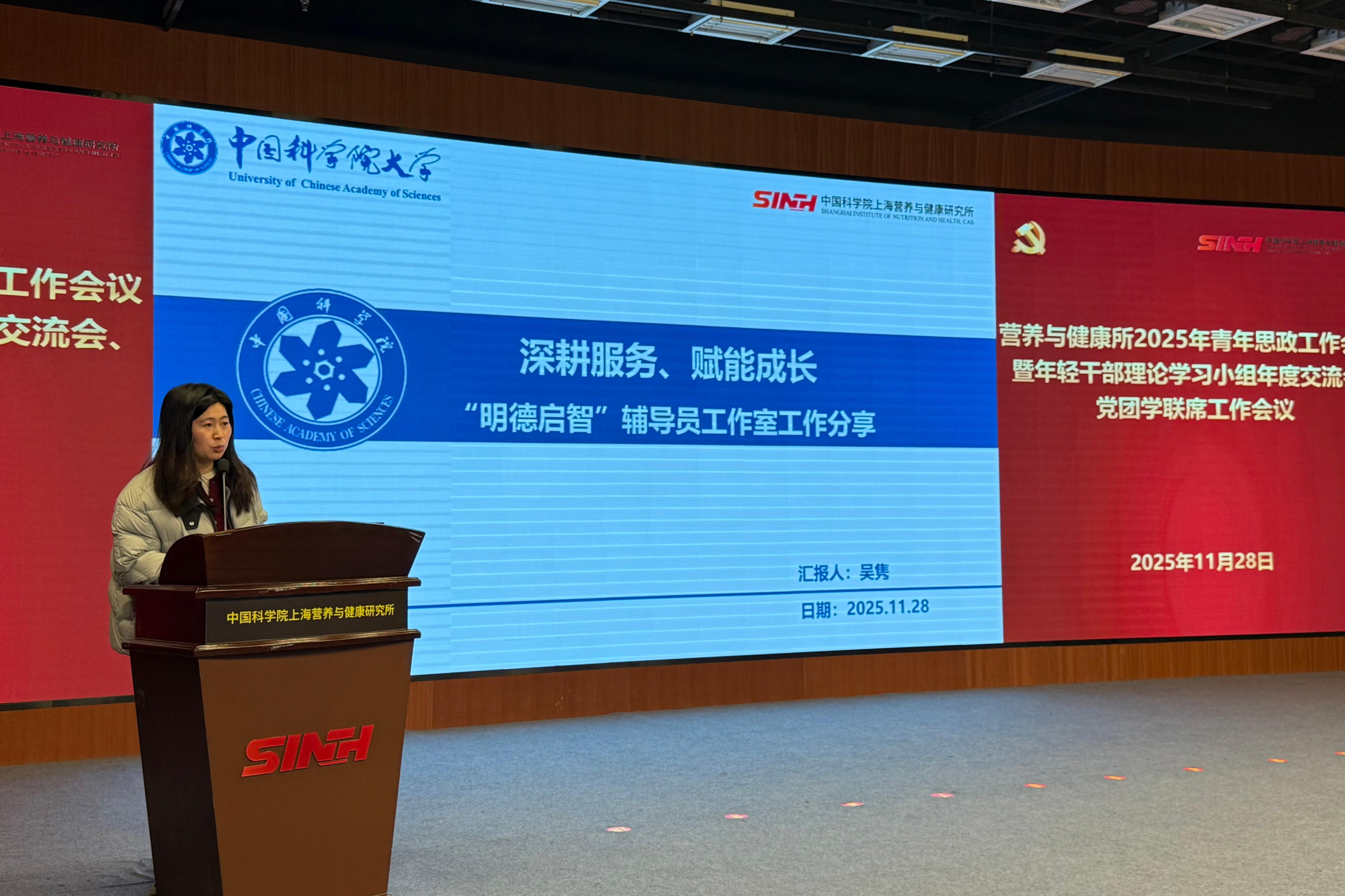 11月28日下午,為進一步推動青年干部和科研人員在研究所高質量發展新征程中展現新擔當、實現新作為,中國科學院上海營養與健康研究所召開2025年青年思政工作會議暨黨團學聯席工作會議。營養與健康所黨委書記瞿榮輝、紀委書記曹永、相關職能部門和黨組織負責人、輔導員代表、各支部青年委員、青年理論學習小組組長及研究生代表近50人參會。