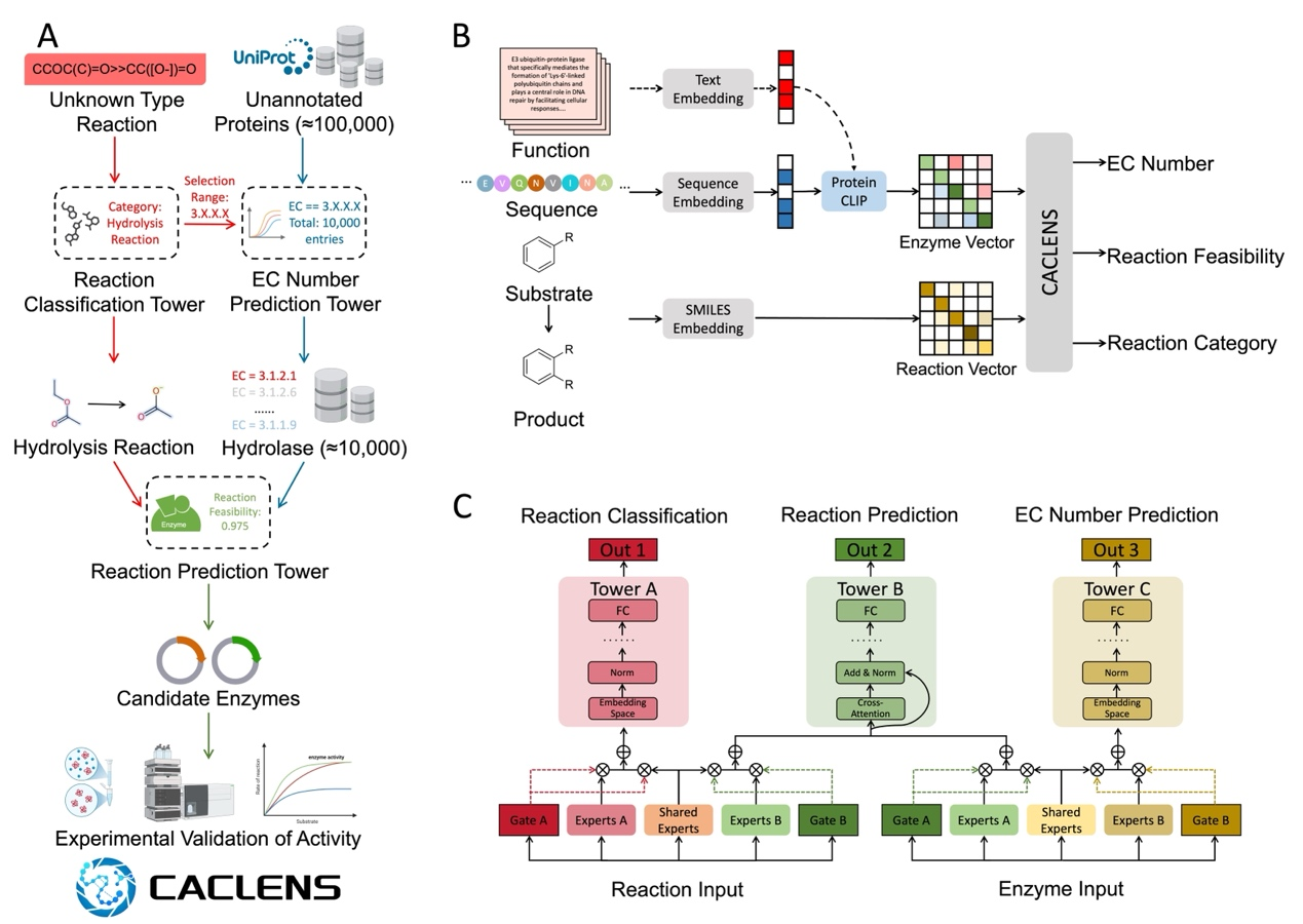 近年來,深度學(xué)習(xí)在酶的結(jié)構(gòu)、功能與性質(zhì)的大規(guī)模預(yù)測領(lǐng)域取得了顯著進展。然而,由于缺乏面向多模態(tài)輸入和多任務(wù)輸出的統(tǒng)一建模能力,現(xiàn)有方法仍難以滿足高性能功能酶篩選的需求。針對這一挑戰(zhàn),研究團隊設(shè)計并開發(fā)了CACLENS (Cross-Attention & Contrastive Learning-enabled Enzyme Selection)框架,將CGC(Customized Gate Control)門控機制、對比學(xué)習(xí)與交叉注意力等方法深度融合,構(gòu)建出可同時執(zhí)行多項預(yù)測任務(wù)的一體化酶篩選平臺。